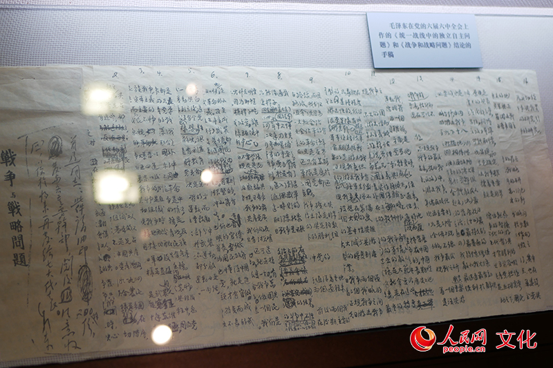 毛泽东在党的六届六中全会上作的《统一战线中的独立自主问题》和《战争和战略问题》结论的手稿,现藏于延安革命纪念馆。人民网 韦衍行 摄