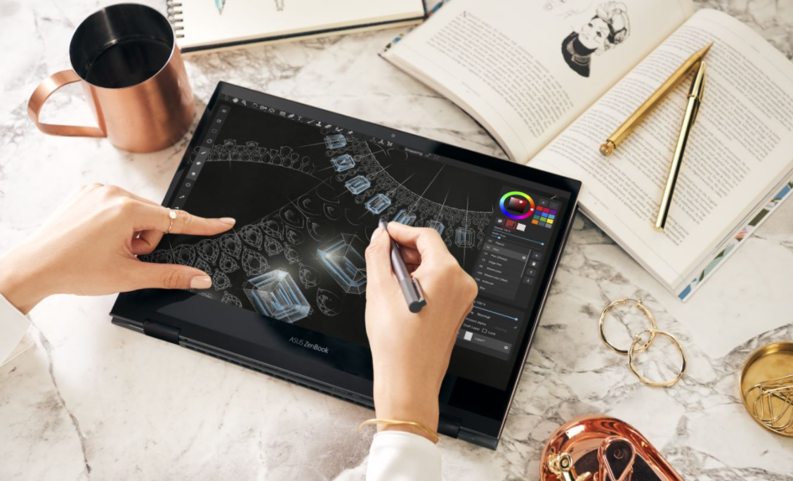 灵耀X逍遥的出色之处在于其搭载的4K OLED显示屏,相比于传统材质的显示屏,灵耀X逍遥的显示屏亮度更高,而超高清分辨率则可表现出精细的画面。另一方面,灵耀X逍遥同样获得了德国TÜV低蓝光认证,缓解长时间使用时的用眼疲劳。此外,为达到高效创作的目的,灵耀X逍遥在设计上加入了360°ErgoLift转轴,使用者可任意角度开合。