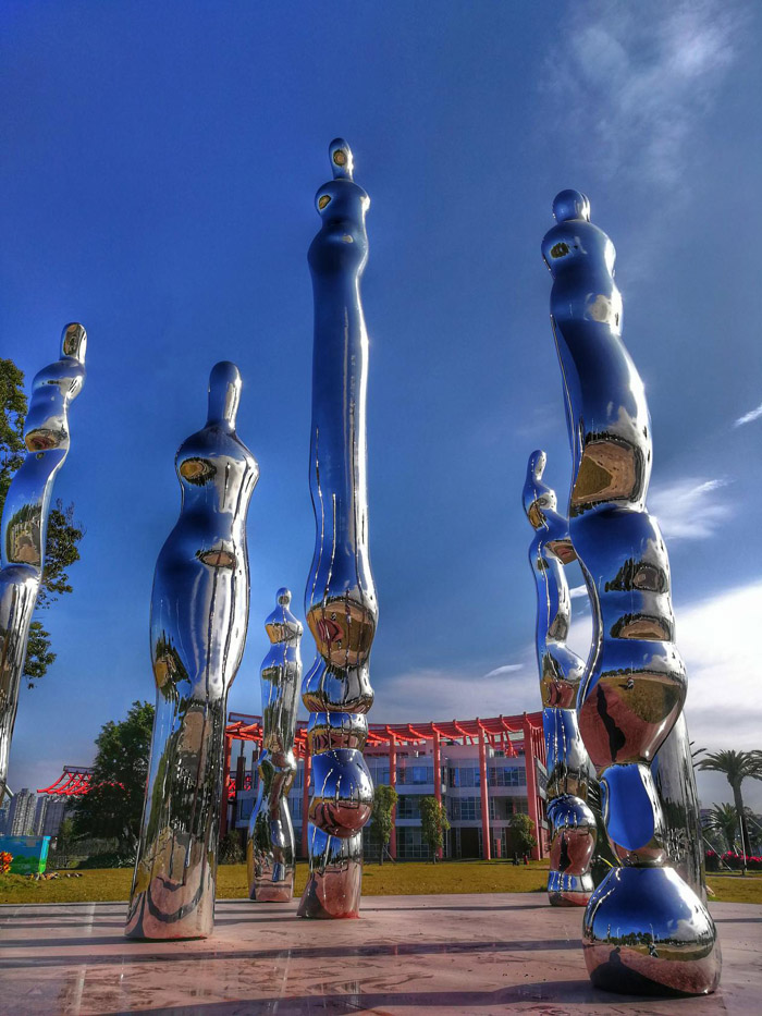 本次展出的作品《众生》,根植于金属雕塑的表现技法,发挥了作者在艺大期间的创作特长和钻研成就。作品从人的各种姿态产生联想,加以抽象地造型组合,刻画出人的喜怒哀乐、悲欢离合等诸多表情形态。并考虑主体与环境的融合呼应等因素,选用有镜面效果的不锈钢材质来反射风景空间。随着时间推移和自然光线变化,雕塑主体与景物、光影相映生辉,无穷变幻、婀娜多姿。通过巧妙地借助金属的材质美和造影效果,塑造了一种抽象循环和造型无限延伸、时间与空间瞬息变幻流转的混沌之美。它使人得以融入雕塑,强调人与雕塑、环境与人的和谐共处,注重造型艺术的参与性;体现人与人之间的共鸣感以及精神内外的融合,追求人的心灵体验。