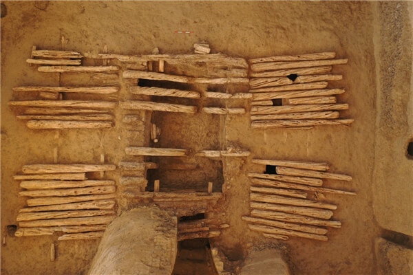 青海都兰热水墓群2018血渭一号墓是一座唐(吐蕃)时期的高级贵族墓葬。地表尚保留茔墙、祭祀建筑、封土和回廊等墓园建筑,地下部分由墓道、照墙、甬道、墓门、墓圹、墓室组成,墓道内发现长条形殉马坑,殉葬6匹4至6岁的公马。墓圹填土中发现殉人和殉牲坑,殉牲坑内出土牛、羊、羚羊、岩羊、牦牛等动物骨骼,底层放置有一把木鞘铁剑。墓室由1个主墓、4个侧室组成,主室东西长6.8米、南北宽4.25米,四壁石砌,顶部平铺棚木,内壁绘有壁画,主室设有东西向红砂岩棺床,棺木上均有彩绘和贴金,主室内出土人骨,初步判定分属两个个体。4个侧室位于主室的南北两侧,与主室间以过道相连,过道内设有木门,侧室东西长3.4米、南北宽2.4米,北部一座侧室内发现有木床。