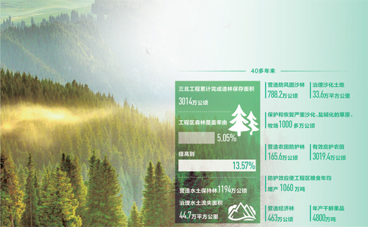 本报北京8月17日电 (记者顾仲阳、寇江泽)记者从国家林业和草原局获悉:三北防护林体系建设工程五期即将完成。三北工程是我国实施的第一个国家级重点林业生态工程,40多年来累计完成造林保存面积3014万公顷,工程区森林覆盖率由5.05%提高到13.57%。