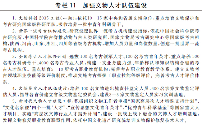 十二、壮大文物人才队伍 坚持文物保护只能加强、不能削弱的原则,综合施策推动构建与文物资源规模、文物保护利用任务相匹配的学科结构、管理机构和专业队伍,不断健全文博人才培养体系,创新人才机制,弘扬践行“莫高精神”,让文物事业后继有人、人才辈出。 (一)推进文物和考古学科专业建设。 梳理文物领域学科框架,完善文物学科体系、学术体系、话语体系。加强文物科学与技术相关学科建设,开展文物科技创新研究。推动考古相关学科专业建设和课程建设,通过“国家关键领域急需高层次人才培养专项招生计划”对考古等相关专业给予积极支持,推动有条件的高等院校适当扩大考古相关专业设置和招生规模,建设一批一流考古学专业。在国家社会科学基金中加大对文物考古研究的支持力度,设立系列研究课题。在国家自然科学基金融合科学领域增设“文物保护科学”方向。大力发展文物修复与保护、文物考古技术、文物展示利用技术、石窟寺保护技术等职业教育专业,引导文博单位深度参与职业教育,鼓励校企共建实习实训基地,支持文物领域大师、名师、工匠进校园参与教育教学活动。 (二)构建多层次文物人才培养体系。 培育一批以领军人才和中青年骨干创新人才为重点的高层次文物人才,加强考古、科技创新、文物鉴定、文物修复、文物展览等急需领域人才培养,加快建设一支门类齐全、技艺精湛的文物技能人才队伍,稳步造就一支科技研发能力和技术应用能力过硬的文物科技人才队伍,锤炼一支熟悉专业、素质优良的文物管理人才队伍。加强相关行业文物保护人才培养。 (三)激发文物人才创新活力。 关心爱护文物工作者,完善人才激励机制,支持鼓励更多优秀专业人才和青年人才从事文物保护研究。建立健全管理规范、评价科学、激励有效的文物人才体系。实行更加积极开放的人才政策,多渠道招聘引进高层次人才,创新文物技能型人才聘用方式。推动文博单位建立体现创新要素价值的收益分配机制。按照国家有关规定,对有杰出贡献的文物工作者予以表彰奖励。 (四)建强文物机构队伍。 进一步加强各级文物保护和考古队伍建设,扩大考古发掘资质单位数量,根据文物资源密集度,核定并落实文物保护和考古专业人员配置量化标准。持续加强基层文物保护研究队伍建设,保持队伍稳定。支持社会力量参与,构建多渠道基层文物保护看护机制。统筹现有资源,加强科研类文博单位建设,打造一批文物保护研究和传承利用高地。