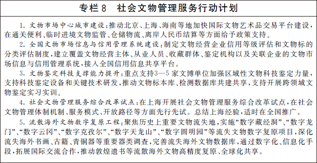 九、优化社会文物管理服务 坚持社会效益优先,加强对民间收藏的指导、管理和服务,健全文物合法流通交易体制机制,优化文物鉴定服务和文物进出境监管,完善流失文物追索返还制度。 (一)促进文物市场健康有序发展。 营造健康的文物市场环境,培育现代文物市场体系,优化文物市场区域布局。强化文物商店作用,探索降低文物商店准营门槛,推动国有文物商店改革。培育一批具有市场美誉度和国际影响力的文物拍卖龙头企业,扶持中小文物经营主体。支持发展现代经营方式,推动文物市场线上线下融合,支持在线展示、交易和定制服务等新业态发展。完善民间收藏文物登记交易制度,建设全国文物市场信息与信用管理系统,完善文物流通信用体系、文物市场全流程协同监管机制。 (二)建立多层次文物鉴定服务体系。 加强涉案文物鉴定评估机构建设,做好刑事、民事、行政等领域相关鉴定工作。支持文博单位、社会力量探索成立文物鉴定机构,提供公益性咨询和经营性活动相结合的鉴定服务。实施文物鉴定职业技能等级认定。加强文物鉴定基础研究、科技支撑和人才培养,加快科技辅助鉴定联合研究与应用推广。健全罚没文物接收和指定收藏机制。 (三)提升文物进出境管理服务水平。 健全文物进出境审核管理体制,加强队伍和管理能力建设。制修订文物出境鉴定国家标准,防止珍贵文物流失。探索建立文物进境登记制度。积极研究调整国有公益性收藏单位进口藏品税收政策。优化文物临时进出境管理服务,支持发展文物仓储、展示等衍生业态。完善文物进出境风险联合防控机制,加强风险布控与执法合作。 (四)构建文物追索返还常态化工作格局。 完善法律法规,做好与相关国际公约衔接,健全部际协调机制,加强专门力量建设。建立中国非法流失文物信息发布机制,加强流失海外文物调查监测,加强中国被盗文物数据库、外国被盗文物数据库建设,推动敦煌遗书等流失文物数字化复原与共享。建立“打击非法贩运文化财产国际日”中国主场活动机制,引导社会力量参与。深度参与国际治理,加强双边、多边合作,促进完善国际规则。